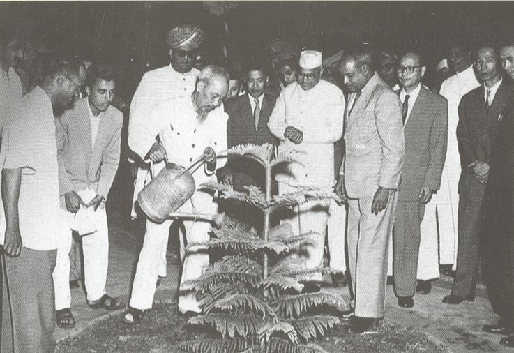 Chủ tịch Hồ Chí Minh trồng cây ở Bangalo (Ấn Độ) trong chuyến thăm Ấn Độ, ngày 11/2/1958. (Nguồn: Tài liệu lưu trữ Bộ Ngoại giao)