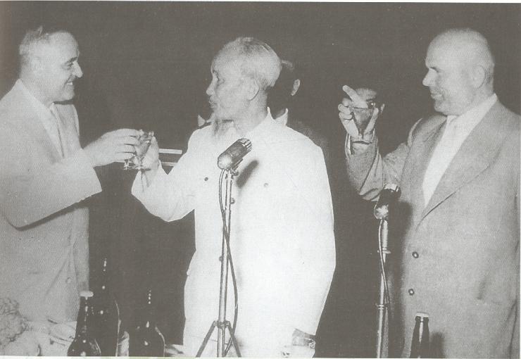 Chủ tịch Hồ Chí Minh và Chủ tịch Hội đồng Bộ trưởng Bunganin cụm ly chúc tình hữu nghị Việt – Xô đời đời bền vững (Hồ Chủ tịch thăm Liên Xô, tháng 7/1955). (Nguồn: Bảo tàng Hồ Chí Minh)
