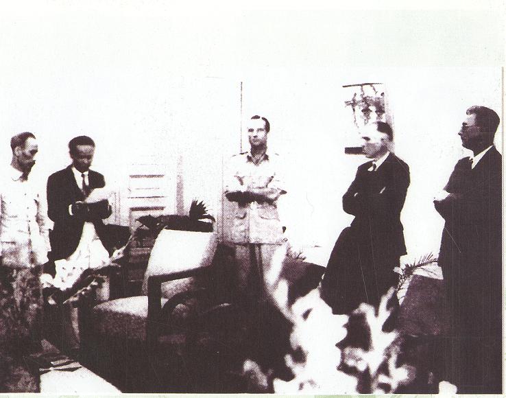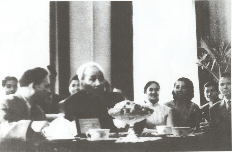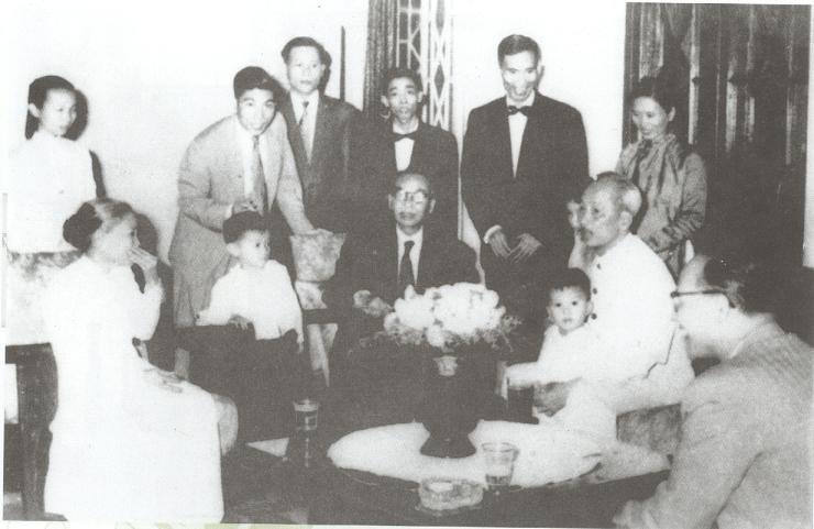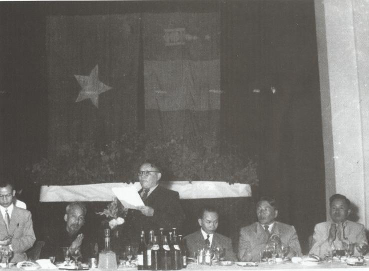 Chủ tịch Hồ Chí Minh và Chính phủ lâm thời chiêu đãi Hoàng thân Lào Xuphanuvông tại Bắc Bộ Phủ, tháng 9/1945. (Nguồn: Khu di tích Hồ Chí Minh tại Phủ Chủ tịch)