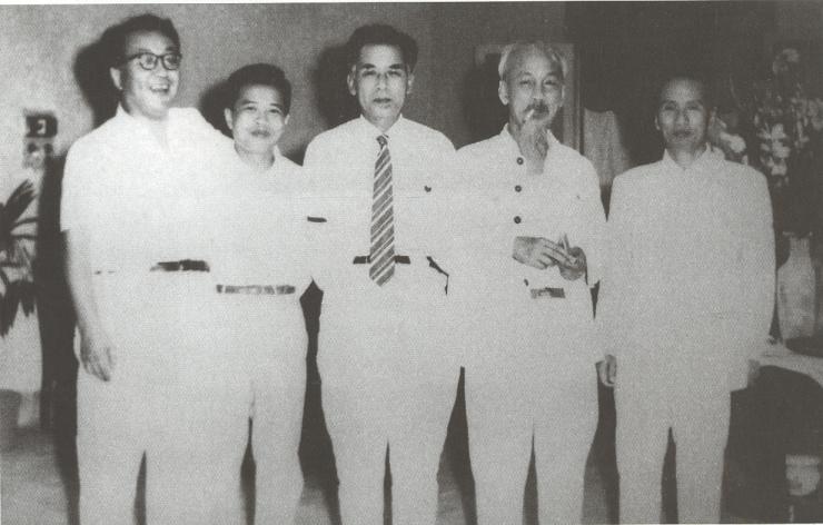 Chủ tịch Hồ Chí Minh, đồng chí Phạm Hùng (thứ 2 từ trái sang), đồng chí Nguyễn Lương Bằng (ngoài cùng bên phải) với các đồng chí trong Đoàn đại biểu Đảng Cộng sản Nhật Bản dự Đại hội đại biểu toàn quốc lần thứ III của Đảng Lao động Việt Nam, tháng 9/1960.