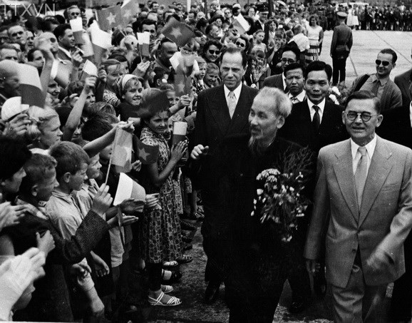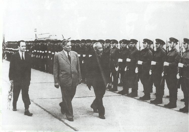 Chủ tịch Hồ Chí Minh sang thăm Liên Xô, tới sân bay Mátxcơva, tháng 8/1957. (Nguồn: Tài liệu lưu trữ Bộ Ngoại giao)