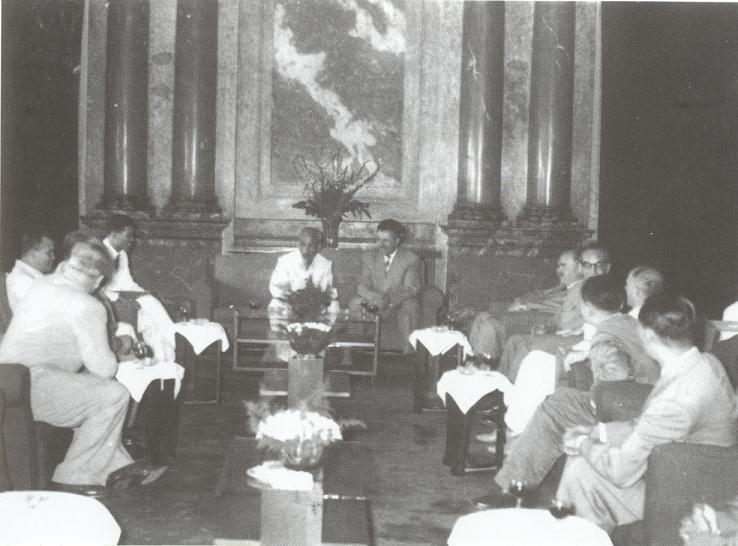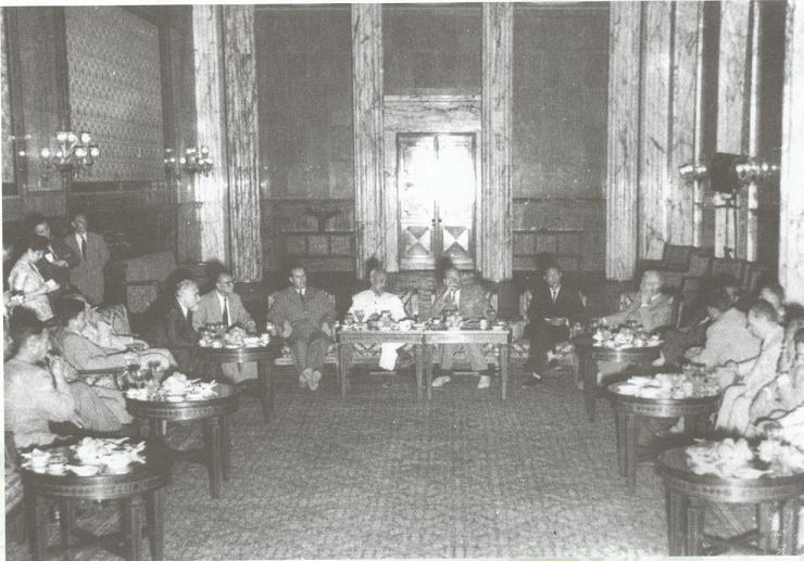 Chủ tịch Hồ Chí Minh tiếp đoàn đại biểu văn hóa Liên Xô trong Khu Phủ Chủ tịch, tháng 4/1958. (Nguồn: Khu di tích Hồ Chí Minh tại Phủ Chủ tịch)