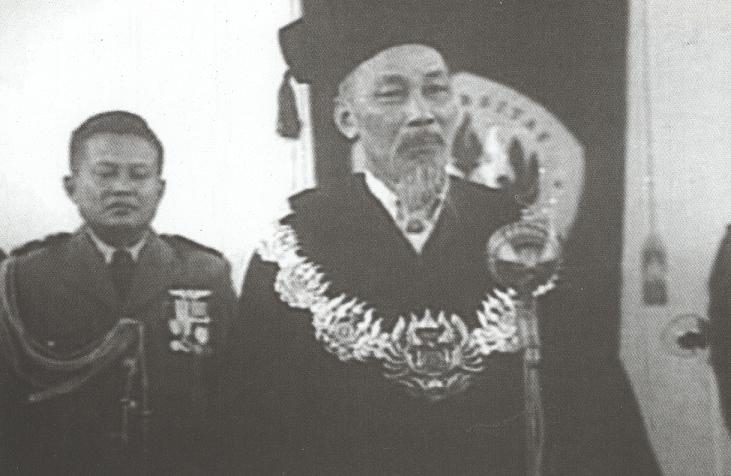 Chủ tịch Hồ Chí Minh trong buổi lễ nhận bằng Tiến sĩ danh dự luật học tại trường Đại học Patgiaran, Băngđung, Cộng hòa Inđônêxia, tháng 3/1959. (Nguồn: Khu di tích Hồ Chí Minh tại Phủ Chủ tịch)