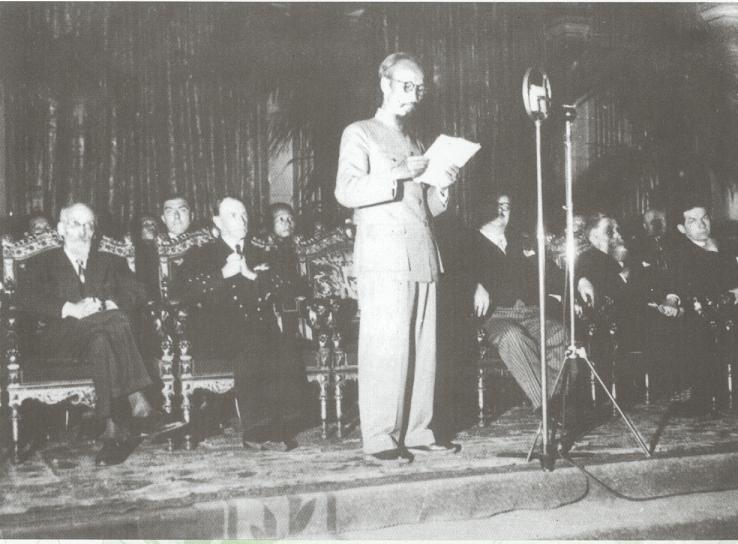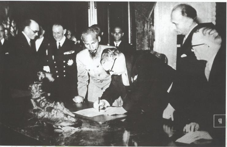 Chủ tịch Hồ Chí Minh và các đại diện Pháp, Đồng minh nghe đọc thông qua bản Tạm ước 6/3 trước khi ký kết chính thức tại Hà Nội, ngày 6/3/1946. (Nguồn: Khu di tích Hồ Chí Minh tại phủ Chủ tịch)