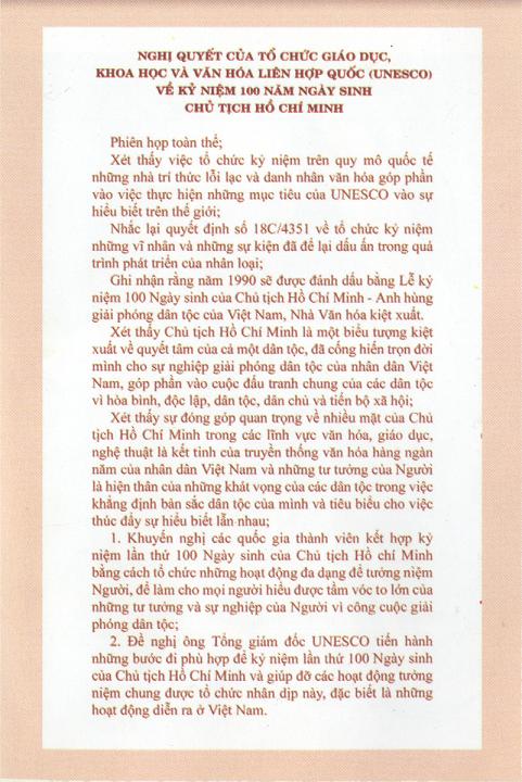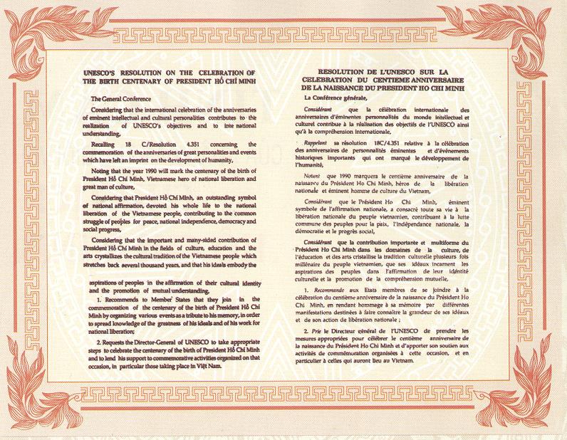 Nghị quyết của Tổ chức Giáo dục, Khoa học và Văn hóa của Liên hợp quốc (UNESCO) năm 1987 về kỷ niệm 100 năm ngày sinh Chủ tịch Hồ Chí Minh (19/5/1890 – 19/5/1990). (Nguồn: Bảo tàng Hồ Chí Minh)