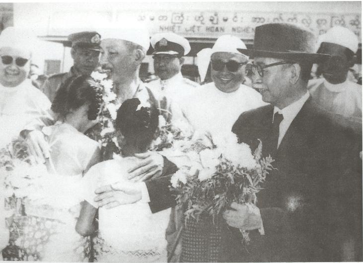 Chủ tịch Hồ Chí Minh và Phó Thủ tướng Phan Kế Toại trong đoàn đại biểu Chính phủ Việt Nam Dân chủ Cộng hòa nhận hoa chúc mừng của thiếu nhi Miến Điện, tháng 2/1958. (Nguồn: Tài liệu lưu trữ Bộ Ngoại giao)