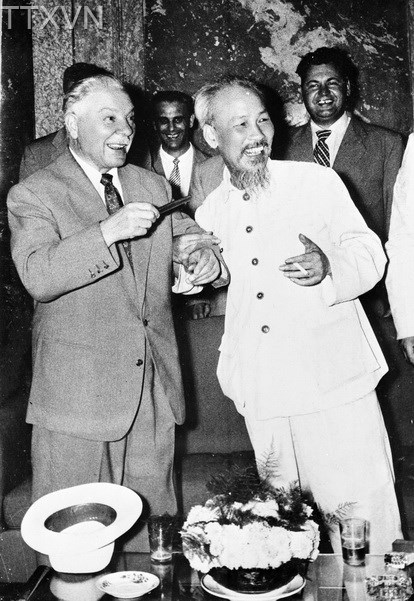 Chủ tịch Hồ Chí Minh tiếp đoàn đại biểu phong trào hòa bình Pháp sang thăm Việt Nam, ngày 15/3/1955. (Nguồn: Tài liệu lưu trữ Bộ Ngọai giao)
