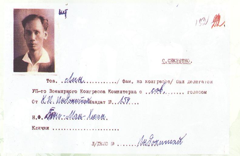 Thẻ tham dự Đại hội lần thứ VII Quốc tế Cộng sản của đồng chí Lin, tức Nguyễn Ái Quốc, tháng 7/1935. (Nguồn: Khu di tích Hồ Chí Minh tại Phủ Chủ tịch)