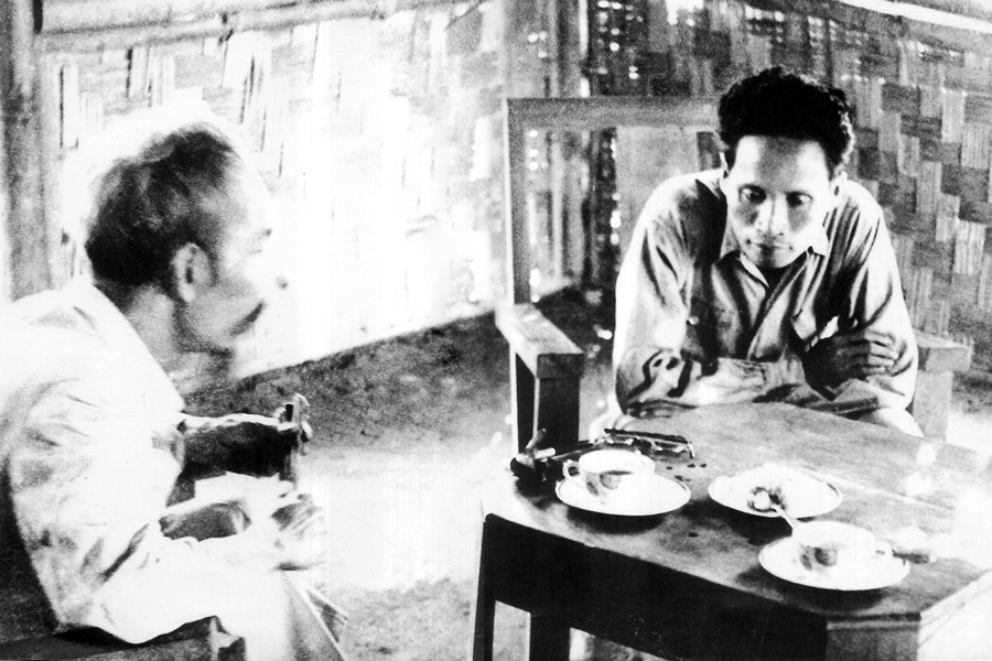 Chủ tịch Hồ Chí Minh làm việc với Phó Thủ tướng Phạm Văn Đồng tại Hang Thia, xã Tân Trào, huyện Sơn Dương, tỉnh Tuyên Quang