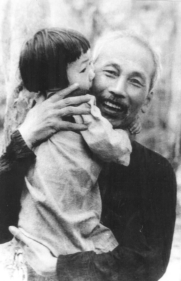 Bác Hồ bế cháu Nguyễn Minh Phương khi Người về thăm nhà trẻ quân đội tại Đầm Hồng, 1950