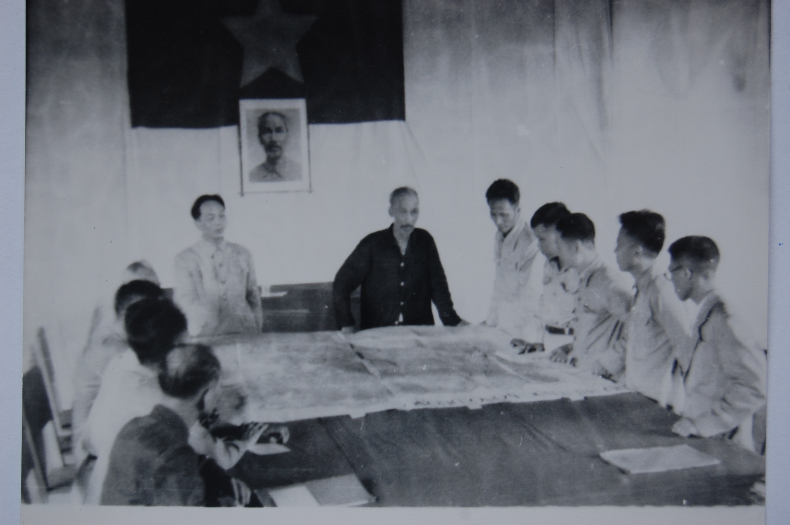 Chủ tịch Hồ Chí Minh cùng các thành viên Hội đồng Chính phủ đang nghiên cứu bản đồ trong một phiên họp Chính phủ