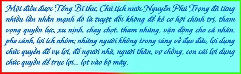 Một điều được Tổng Bí thư, Chủ tịch nước nhiều lần nhấn mạnh, đó là tuyệt đối không để kẻ cơ hội chính trị, tham vọng quyền lực, xu nịnh, chạy chọt, tham nhũng, vận động cho cá nhân, phe cánh, lợi ích nhóm; những người không trong sáng về đạo đức, lợi dụng chức quyền để vụ lợi, để người nhà, người thân, vợ chồng, con cái lợi dụng chức quyền để trục lợi... lọt vào bộ máy.