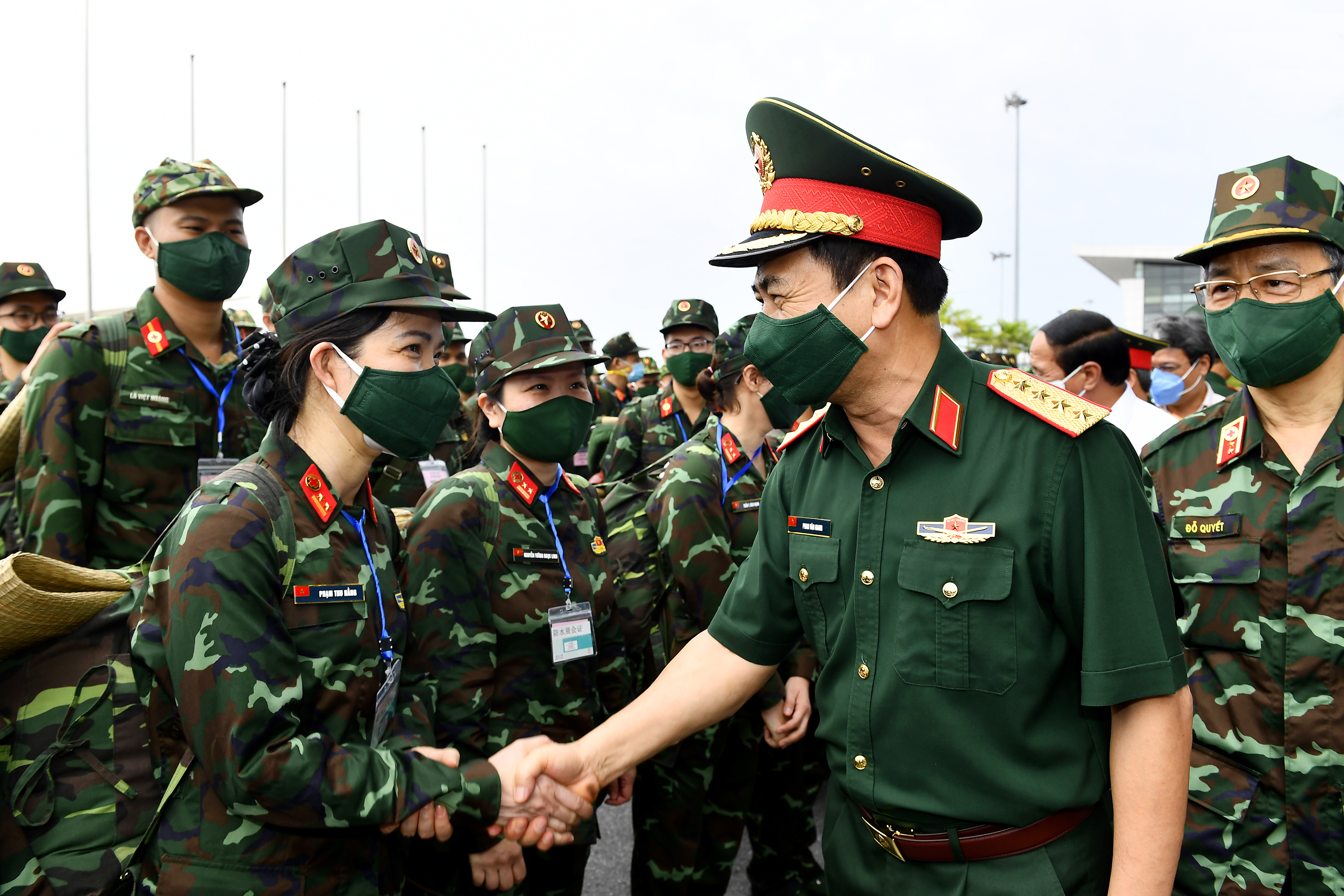 Đại tướng Phan Văn Giang, Ủy viên Bộ Chính trị, Bộ trưởng Bộ Quốc phòng động viên các thầy thuốc quân y trước lúc lên đường vào miền Nam chống dịch. Ảnh: Tư liệu