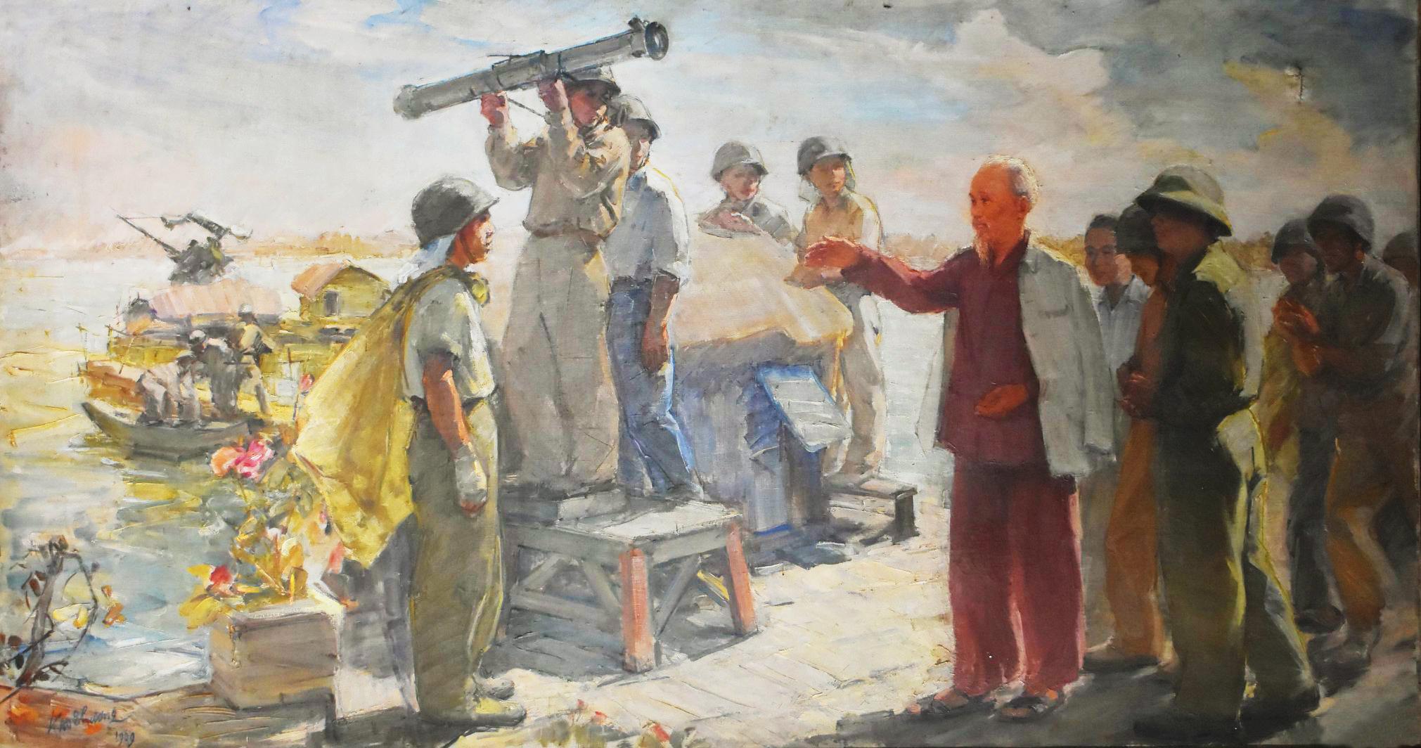 Bác Hồ thăm bộ đội cao xạ (Tranh: Họa sĩ Nguyễn Cao Thương).