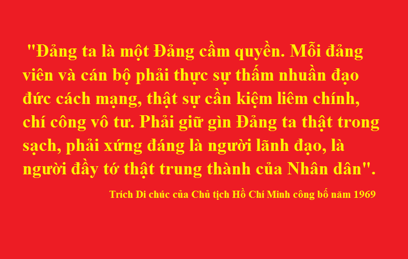 Chủ tịch Hồ Chí Minh đi xa đã 55 năm, song tư tưởng Hồ Chí Minh về “Đảng ta là một đảng cầm quyền, mỗi đảng viên và cán bộ phải thật sự thấm nhuần đạo đức cách mạng, thật sự cần kiệm liêm chính, chí công vô tư. Phải giữ gìn Đảng ta thật trong sạch, phải xứng đáng là người lãnh đạo, là người đầy tớ thật trung thành của Nhân dân”[1] và những nỗ lực không mệt mỏi của Người để xây dựng Đảng Cộng sản Việt Nam trong sạch, vững mạnh vẫn vẹn nguyên giá trị thời sự. Càng nhiều khó khăn, thử thách, toàn Đảng càng phải thấm nhuần và thực hiện tư tưởng và những lời căn dặn của Người trong Di chúc để không ngừng nâng cao năng lực lãnh đạo, sức chiến đấu của từng cấp ủy, tổ chức cơ sở Đảng, của từng cán bộ, đảng viên, đáp ứng yêu cầu của tình hình, nhiệm vụ cách mạng đòi hỏi.