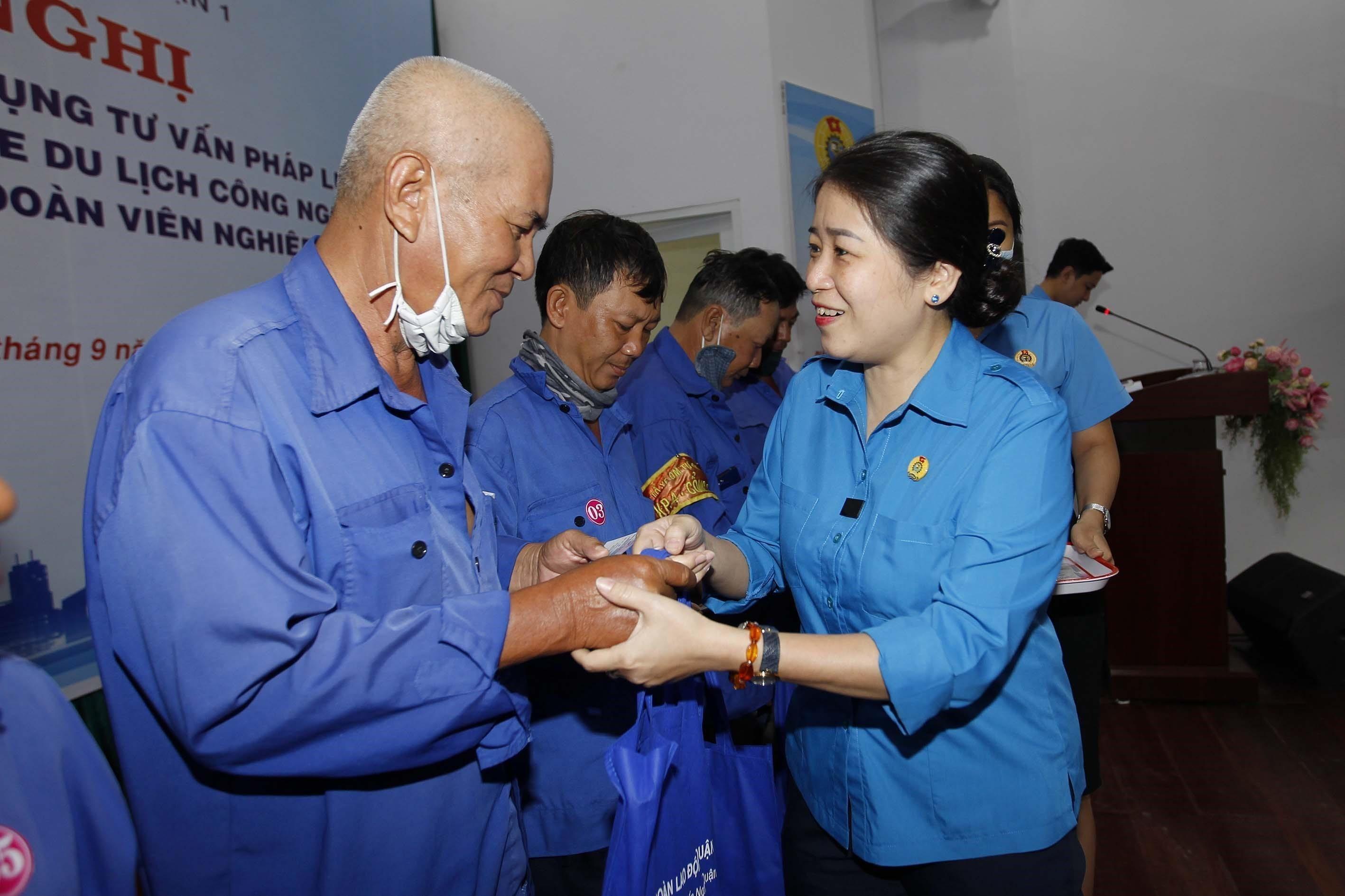 Chủ tịch Liên đoàn Lao động Quận 1 (Thành phố Hồ Chí Minh) trao quà và tặng thẻ bảo hiểm y tế cho đoàn viên công đoàn có hoàn cảnh khó khăn. Ảnh: TTXVN